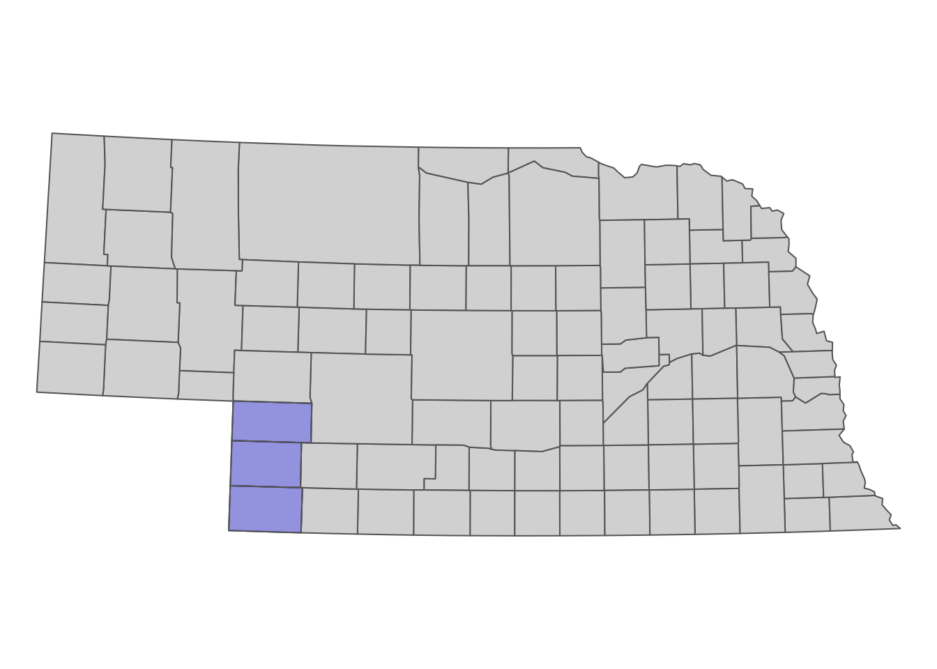 The geographic focus of the project is the southwest corner of Nebraska consisting of Chase, Dundy, and Perkins County (see Figure 1.1 for their locations within Nebraska). Let’s read a shape file of the three counties represented as polygons. We will use it later to spatially filter groundwater level data downloaded from NWIS.