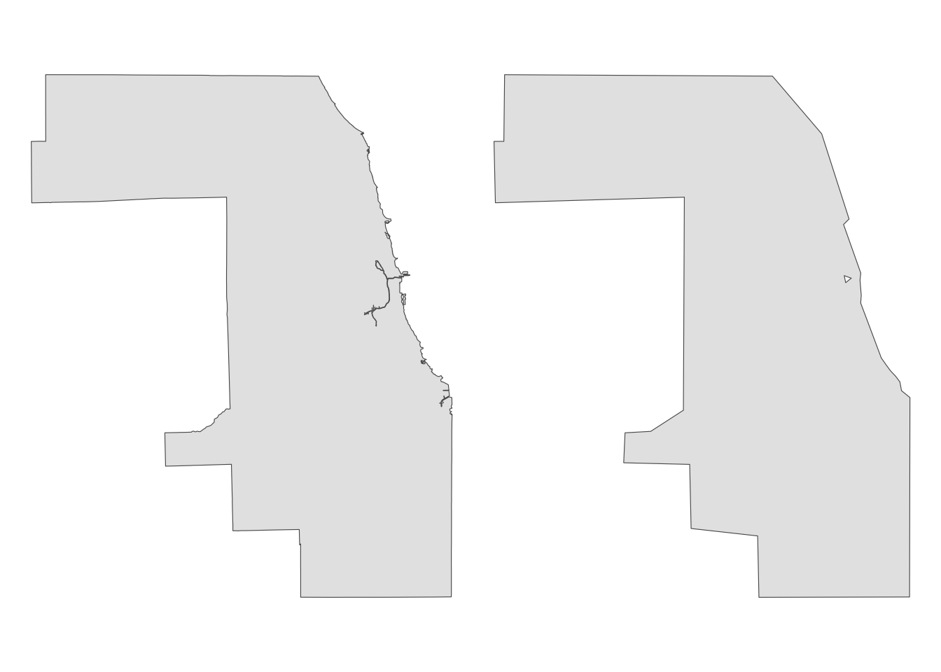 You can see that its border with Lake Michigan has lots of non-linear segments. Let’s simplify this using sf::st_simplify(). We can use the dTolerance option to specify the degree of simplification.