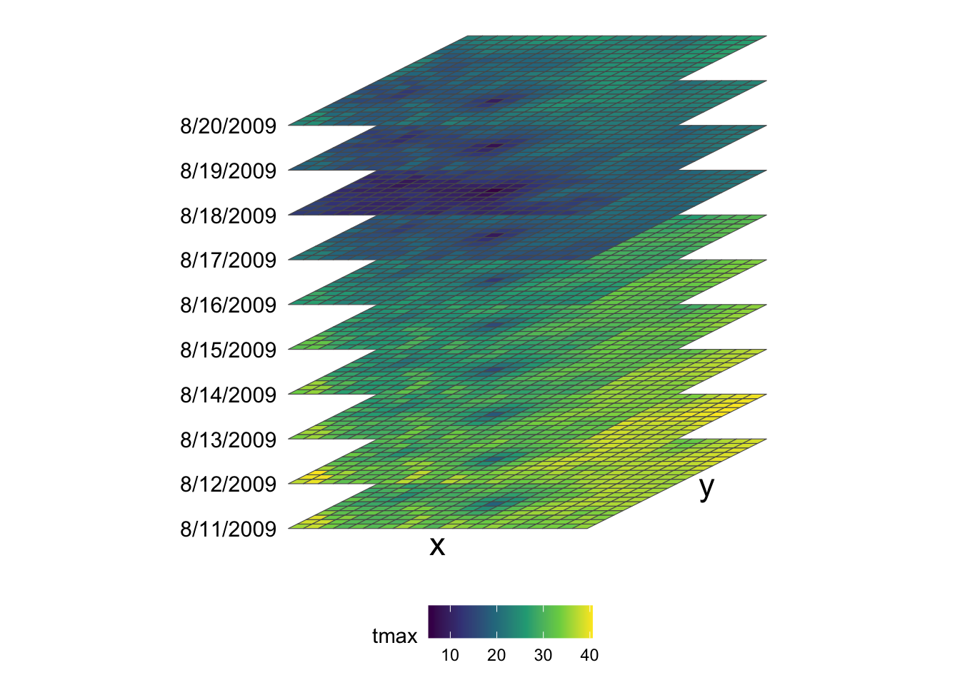 The dimension characteristics of x and y are shared by all the layers across the date dimension, and a particular combination of x and y indexes refers to exactly the same location on the earth in all the layers across dates (of course). In the date dimension, we have 10 date values since the from for date is 1 and to for date is 10. The refsys of the date dimension is Date. Since the offset is 2009-08-11 and delta is 1, \(k\)th layer represents tmax values for August \(11+k-1\), 2009.