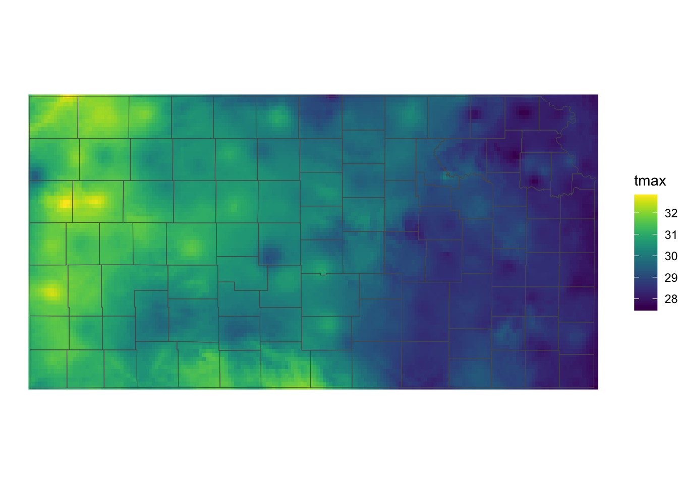extacted_mean <- exactextractr::exact_extract(tmax_m8_y09_KS_sr, KS_county_sf, "mean", append_cols = "COUNTYFP", progress = FALSE)