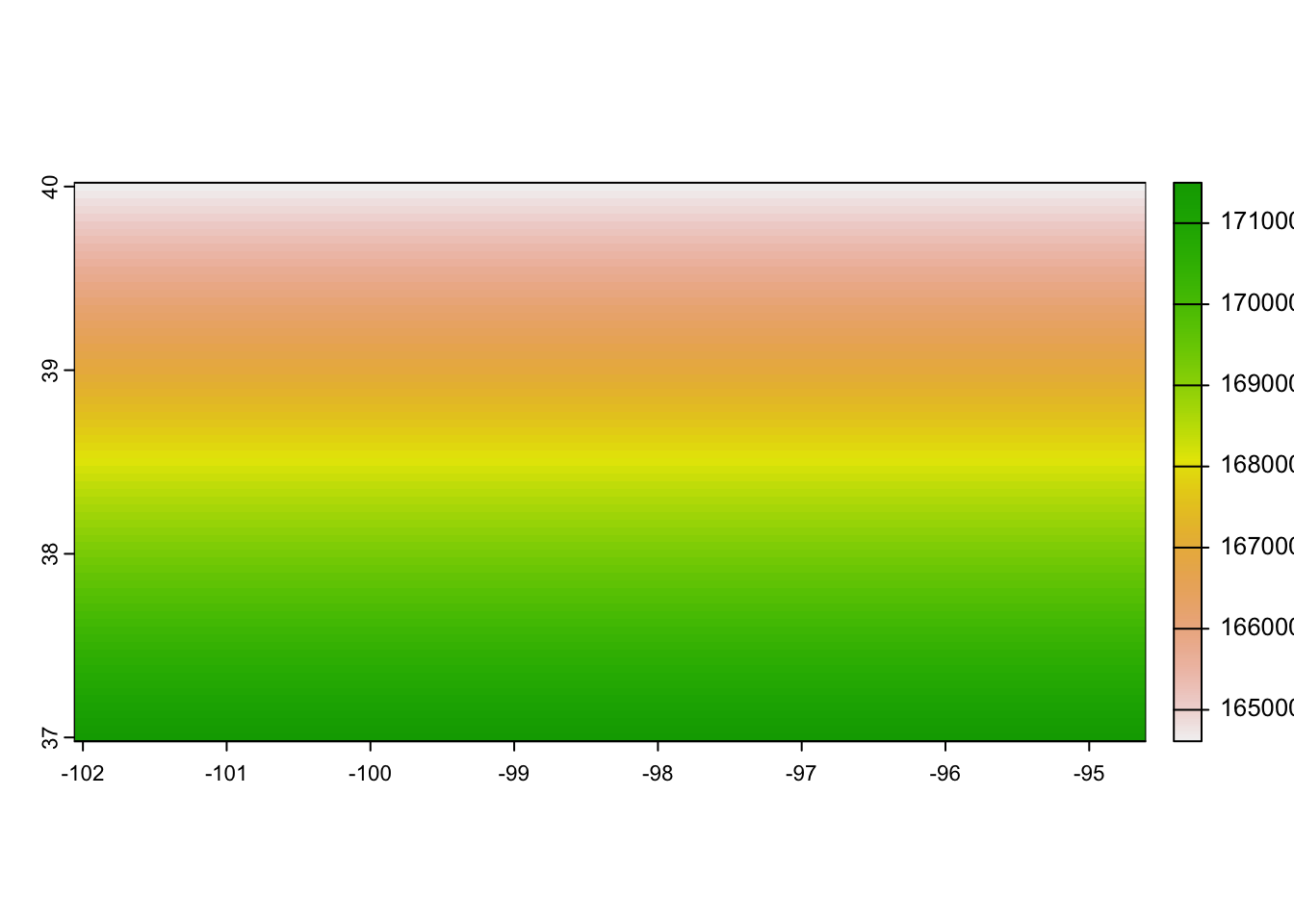 The output is a SpatRaster, where the area of the cells are stored as values. Figure 6.11 shows the map of the PRISM raster cells in Kansas, color-differentiated by area.
