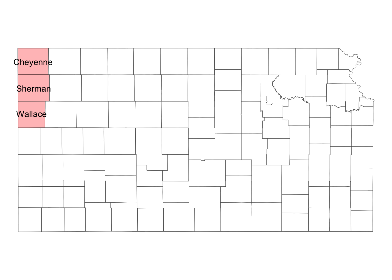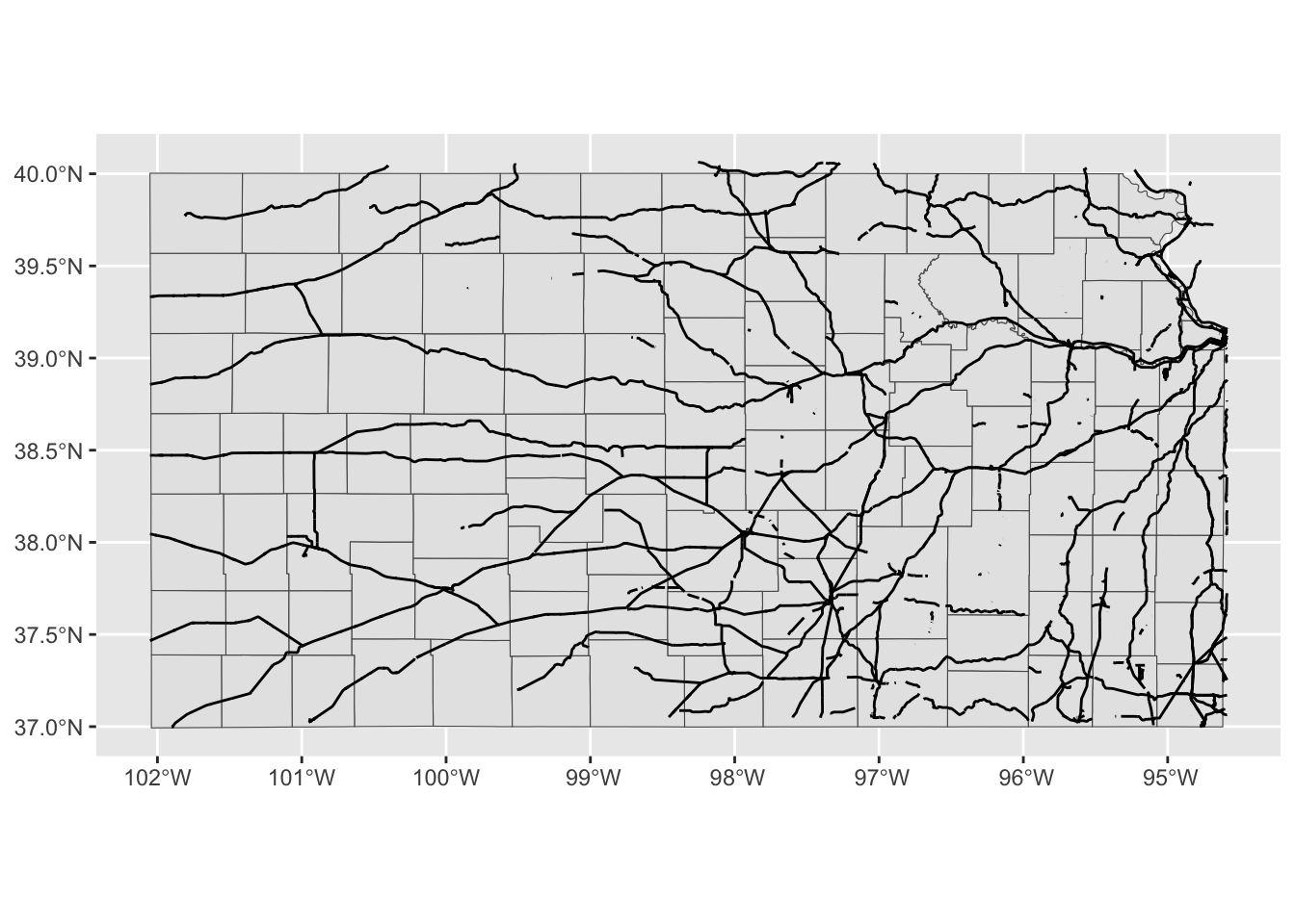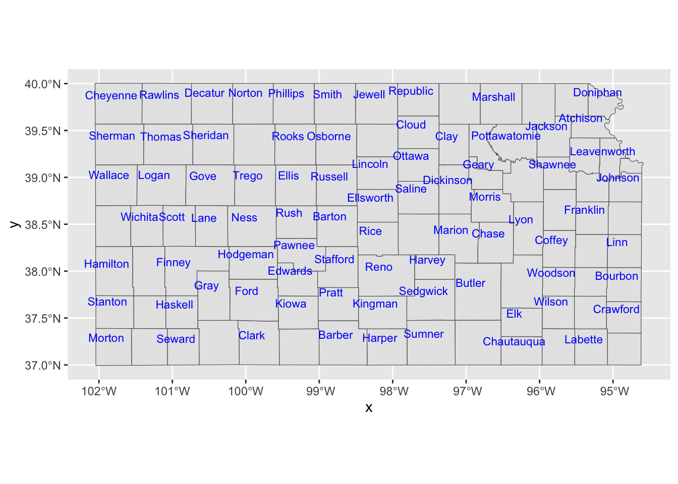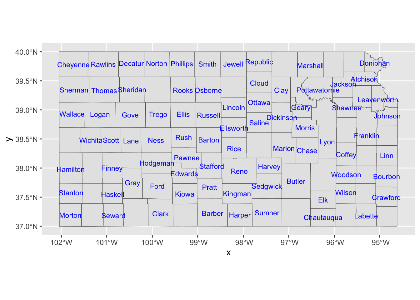 tigris::counties(state = "Kansas", cb = TRUE, progress_bar = FALSE) %>%