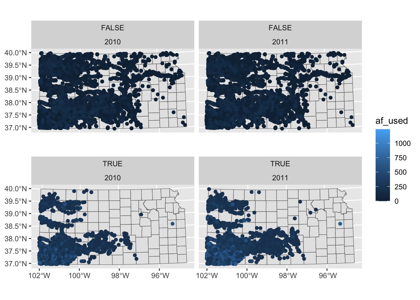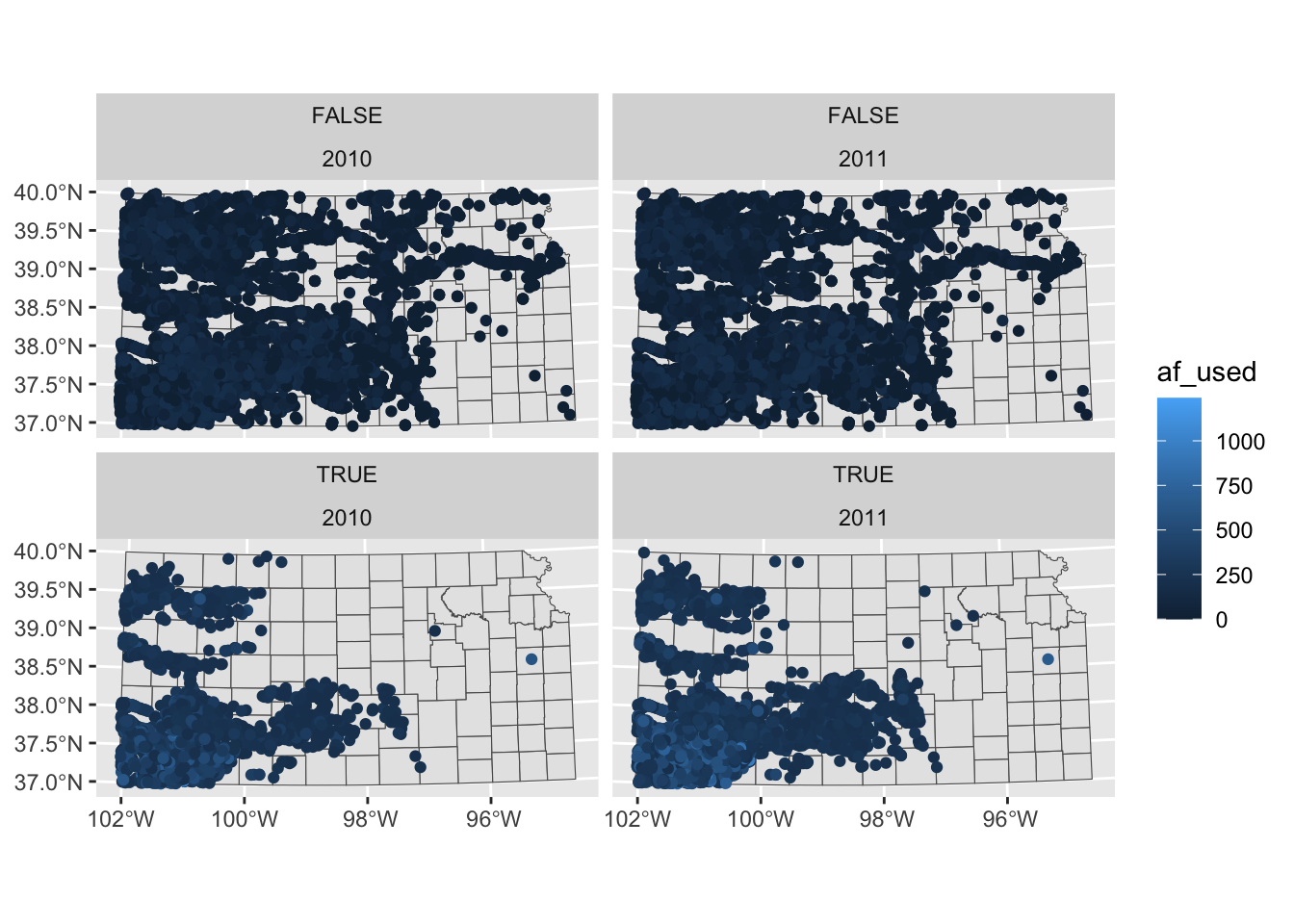 You probably noticed that the high water use cases are now appear on top. This is because the panels of figures are arranged in a way that the strip texts are alphabetically ordered. High water use precedes Low water use. Sometimes, this is not desirable. To force a specific order, you can turn the faceting variable (here high_low) into a factor with the order of its values defined using levels =. The following code converts high_low into a factor where “Low water use” is the first level and “High water use” is the second level.